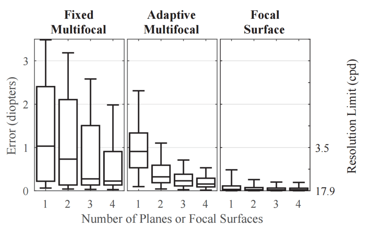 0.5 D. Following Narain et al. [2015], the fixed multifocal display employs four planes evenly spaced from 0.2 D to 2.0 D. The adaptive multifocal display and the focal surface display are optimized using k-means clustering, following Wu et al. [2016], and the methods in Sections 3.1 and 3.2 to position planes across a 5.0 D span, respectively. Focal surface displays show significantly fewer depth errors, with errors decreasing as more surfaces are used.